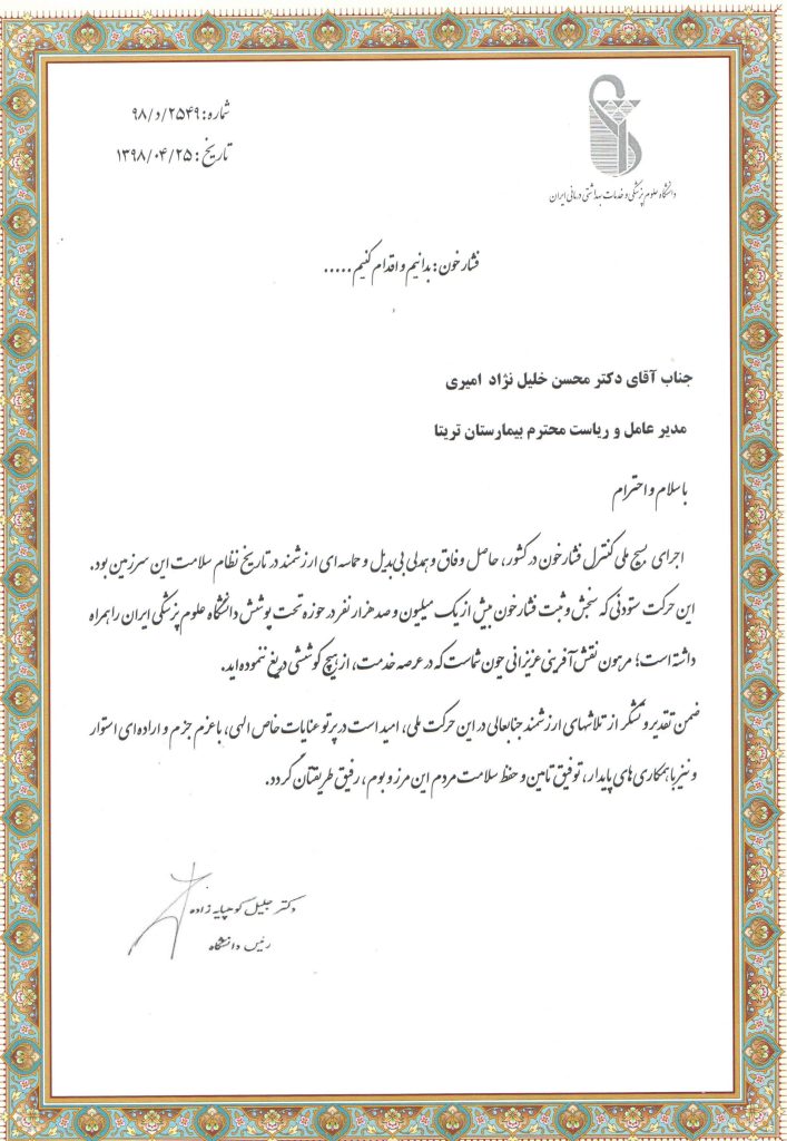 7_ حرکت به سمت استقرار کامل توریسم سلامت و ارائه خدمت بهینه به بیماران خارجیمسئولین کلیه بخش ها و واحدها، با مسئولیت پذیری، مسیر حرکت تیم خود را در راستای اهداف و استراتژی های بیمارستان تنظیم نموده و با بازنگری دوره ای از بهبود مستمر خدمات در تمامی امور جاری اطمینان حاصل می نمایند. همچنین در اجرای استراتژی ها، با حداکثر توان علمی و رفتار شهروندی سازمانی ممتاز خود در راستای دست یابی به اهداف گام برخواهند داشت.
