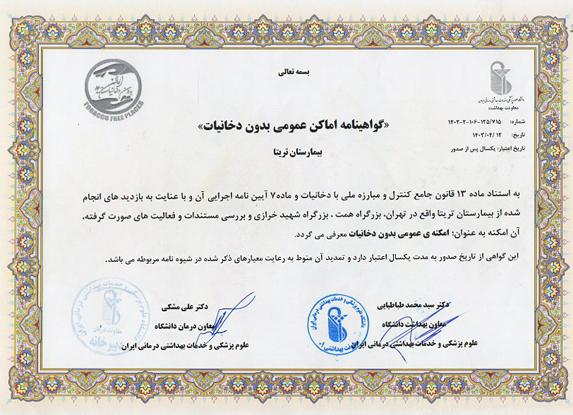 بيمارستان تریتا كه تحت پوشش دانشگاه علوم پزشکی ایران است در راستای مدیریت ارائه خدمات درمانی در چار چوب دستورالعمل اعتباربخشی به منظور ارتقای کیفیت خدمات درمانی، تشخيصی و توانبخشی اهداف ذیل را دنبال می کند.